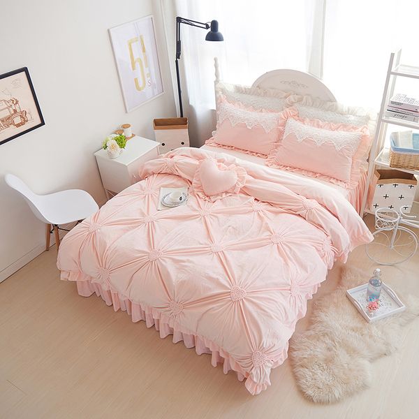 Pink Ruffle Princess Cotton Duvet Cover Wedding Bedding Set Queen